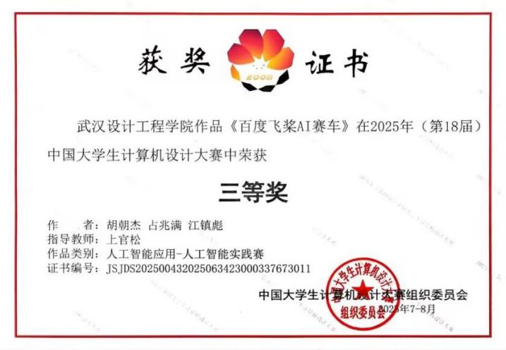 本次大赛中,由上官松老师指导的胡朝杰、占兆满、江镇彪团队,凭借作品《百度飞桨AI赛车》荣获“人工智能应用-人工智能实践赛”全国三等奖。该作品以百度飞桨深度学习框架为核心,结合智能感知与控制技术,设计出一款具备自主决策能力的AI赛车模型,实现了精准多目标识别和高效路径规划,展现了优秀的AI边缘计算技术实践能力,获得大赛评委的充分肯定。
