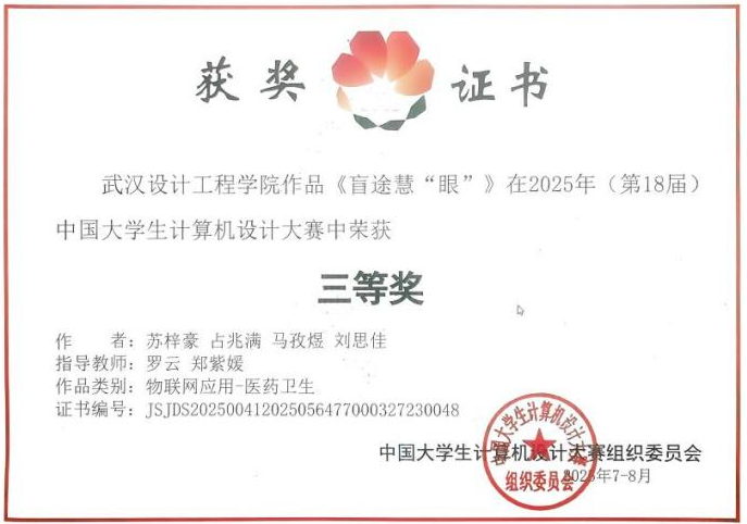 由罗云、郑紫媛两位老师联合指导的苏梓豪、占兆满、马孜煜、刘思佳团队,凭借作品《盲途慧“眼”》斩获“物联网应用-医药卫生”全国三等奖。该作品聚焦视障群体出行难题,通过物联网传感器与智能算法融合,开发出可实时感知环境、语音导航的辅助设备,为医疗健康领域的无障碍服务提供了创新解决方案,体现了技术温度与社会价值的深度结合,获得大赛评委的高度评价。